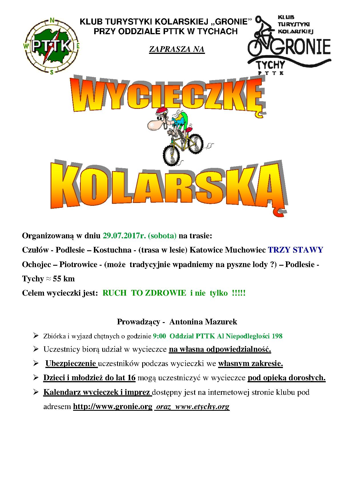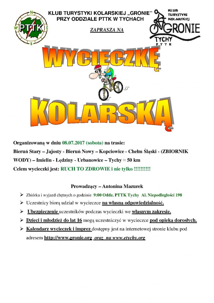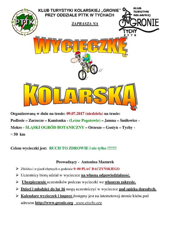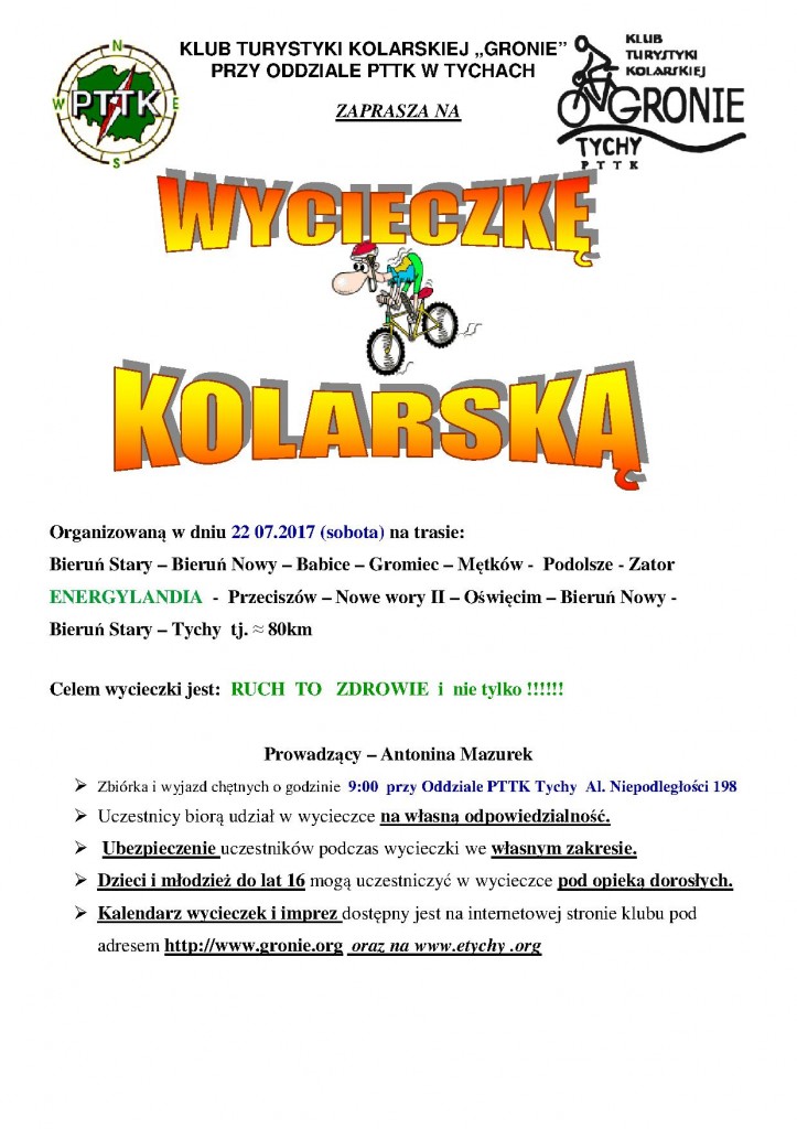22.07.2017 w sobotę Klub Turystyki Kolarskiej GRONIE w grupie 7 osobowej wyruszył na wycieczkę poznania nowej trasy tzn. „wałem wiślanym”. Z Bierunia Nowego za mostem po stronie małopolski skierowaliśmy się na wał, którym dojechaliśmy do pierwszej przeszkody, którą były tory kolejowe. Pokonując łatwo przeszkodę dotarliśmy do miejscowości Bobrek udając się do pobliskiego sklepu aby uzupełnić napoje i posilając się kanapeczkami. Od tej miejscowości do Jankowic i Podolsza jechaliśmy wałem wyasfaltowanym równiuteńko bez dziur, garbów i innych niespodzianek na drodze. /mówią, że można już wałami dojechać do Krakowa ale trzeba by było to sprawdzić ????/. Do ENERGYLANDU niestety nie weszliśmy bo bilety drogie i trzeba by było poświęcić trochę czasu aby skorzystać z atrakcji nam zaproponowanych. Droga powrotna też bardzo łatwa i przyjemna bo bez samochodów i bez górek. Bardzo spokojnie dojechaliśmy do Oświęcimia na rynek gdzie skorzystaliśmy z bramki-mgiełki aby się schłodzić i nawodnić bo temperatura była ponad 30 stopni. Z Oświęcimia do Babic bardzo bezpiecznie udaliśmy się na wał wiślany którym dojechaliśmy do miejsca w który naszą podróż rozpoczęliśmy. W Bieruniu Nowym również wjechaliśmy na wał i po około 300 m zjechaliśmy na lokalną asfaltówkę którą dojechaliśmy do Bijasowic – Jajost – Bierunia St. i Tychów.