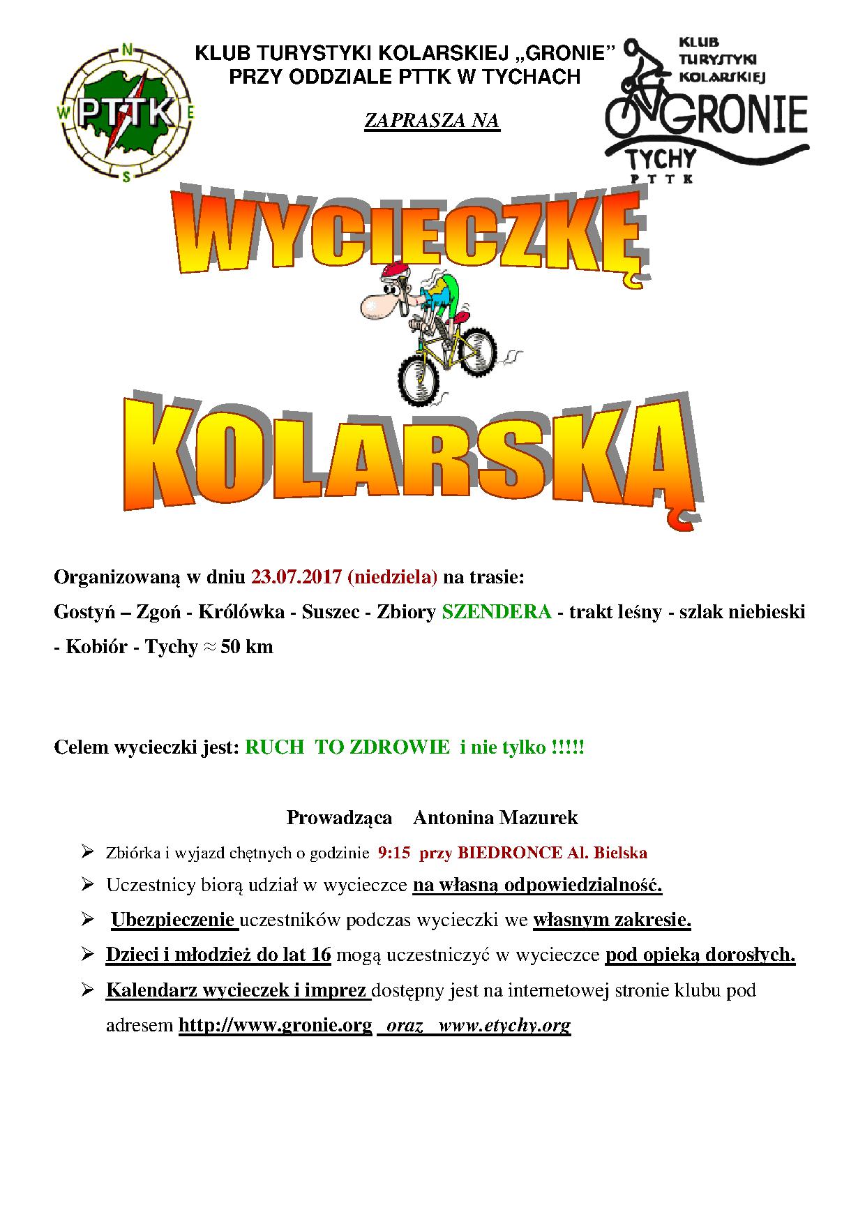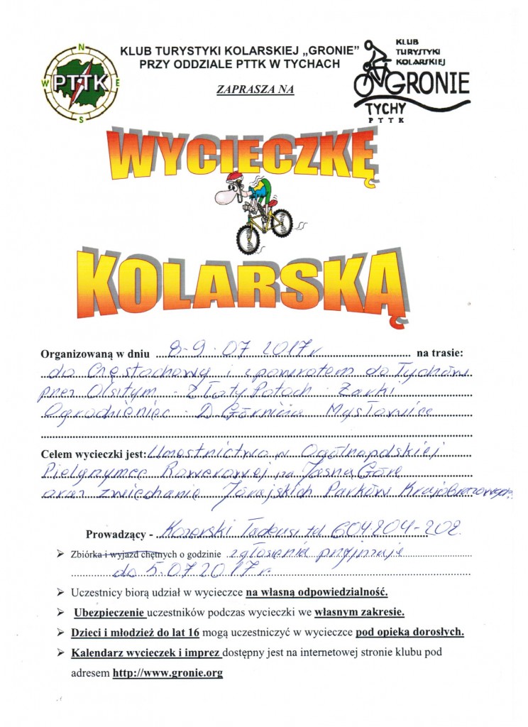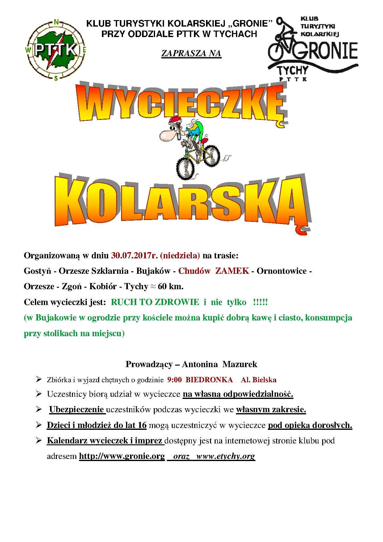22.07.2017 w sobotę Klub Turystyki Kolarskiej GRONIE w grupie 7 osobowej wyruszył na wycieczkę poznania nowej trasy tzn. „wałem wiślanym”. Z Bierunia Nowego za mostem po stronie małopolski skierowaliśmy się na wał, którym dojechaliśmy do pierwszej przeszkody, którą były tory kolejowe. Pokonując łatwo przeszkodę dotarliśmy do miejscowości Bobrek udając się do pobliskiego sklepu aby uzupełnić napoje i posilając się kanapeczkami. Od tej miejscowości do Jankowic i Podolsza jechaliśmy wałem wyasfaltowanym równiuteńko bez dziur, garbów i innych niespodzianek na drodze. /mówią, że można już wałami dojechać do Krakowa ale trzeba by było to sprawdzić ????/. Do ENERGYLANDU niestety nie weszliśmy bo bilety drogie i trzeba by było poświęcić trochę czasu aby skorzystać z atrakcji nam zaproponowanych. Droga powrotna też bardzo łatwa i przyjemna bo bez samochodów i bez górek. Bardzo spokojnie dojechaliśmy do Oświęcimia na rynek gdzie skorzystaliśmy z bramki-mgiełki aby się schłodzić i nawodnić bo temperatura była ponad 30 stopni. Z Oświęcimia do Babic bardzo bezpiecznie udaliśmy się na wał wiślany którym dojechaliśmy do miejsca w który naszą podróż rozpoczęliśmy. W Bieruniu Nowym również wjechaliśmy na wał i po około 300 m zjechaliśmy na lokalną asfaltówkę którą dojechaliśmy do Bijasowic – Jajost – Bierunia St. i Tychów.