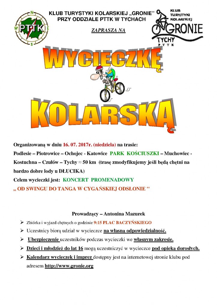 16.07.2017 w niedzielę Klub Turystyki Kolarskiej GRONIE wyjechał w 13 osobowej grupie na koncert promenadowy do Parku Kościuszki w Katowicach. Koncerty promenadowe odbywają się w wakacje każdego roku proponując utwory muzyczne od Bacha do Beatlesów tzn. muzyka klasyczna i rozrywkowa a tym razem wysłuchaliśmy cygańskich aranżacji klasycznego tanga. Po koncercie ruszyliśmy w kierunku Piotrowic na pyszne lody do DŁUCIKA. Trasa na koncerty jest bardzo łatwa i krótka bo wynosi tylko 42 km. Pozdrawiam serdecznie melomanów i czekam na propozycje na który koncert pojedziemy????