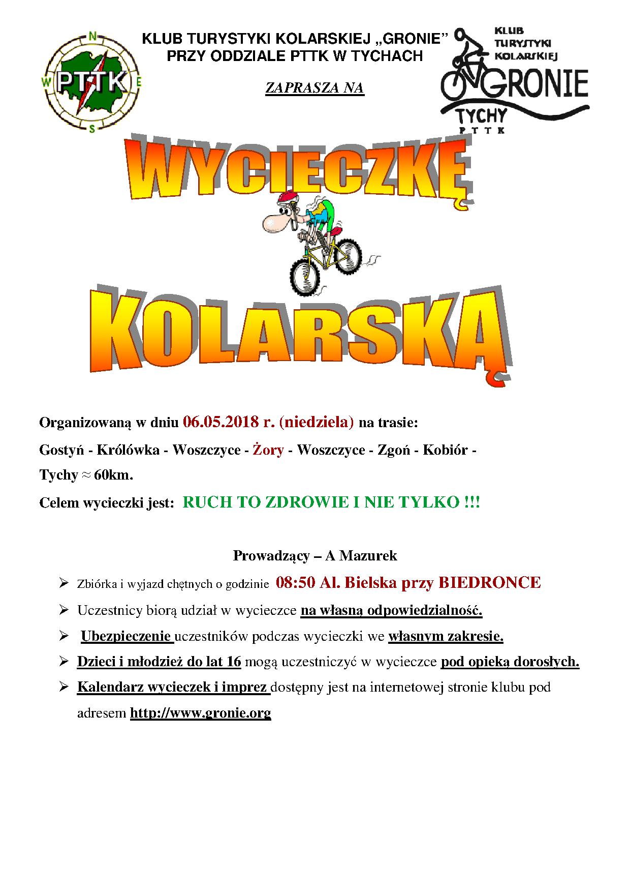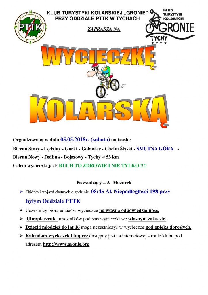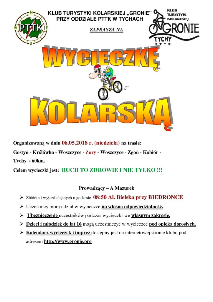 W sobotę 21. 04. 2018 r. w sobotę Klub turystyki Kolarskiej wyruszył na wycieczkę rekreacyjną z członkami klubu oraz z sympatykami przez Bieruń Stary – Jajosty – Jedlinę – Wolę – Frydek – Bodzów Ćwiklice do Pszczyny. Pogoda była przepiękna więc udaliśmy się na zimne napoje oraz na przepyszne lody. Oczywiście nie obyło się bez zdobywania pieczątek na odznaki, które członkowie skrzętnie zdobywają. Do domu wróciliśmy przez Piasek /szlak czerwony w lesie/ i Kobiór. Grupa liczyła 10 osób. Zapraszamy wszystkich chętnych na następne wycieczki organizowane przez KTK GRONIE.