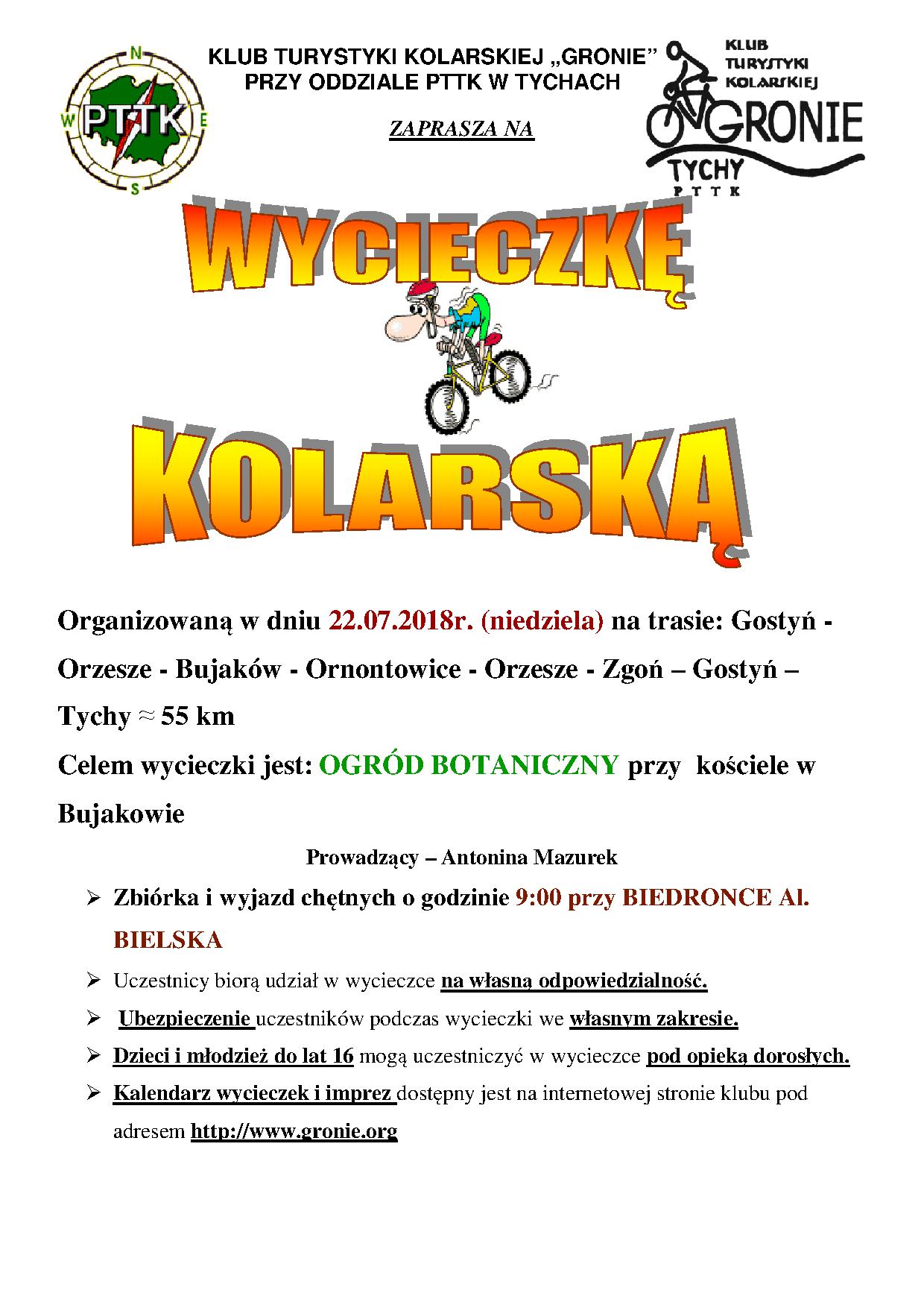 W niedzielę 22.07.2018r. Klub Turystyki Kolarskiej GRONIE zaprosił do zwiedzenia Ogrodu Botanicznego w Bujakowie, tradycją już jest, że co przynajmniej raz w roku bywamy w tym urokliwym miejscu a w niedzielę można wypić kawę i zjeść smacznego kołocza jak tym razem, gdyż był seromakowiec lub sernik. Wyjechaliśmy w grupie 8 osobowej w której znalazły się 3 nowe osoby, które znalazły nas na portalu Tychy i na stronie GRONIA. Tradycyjnie do Gostyni dotarliśmy przez las i dalej szosą do Orzesza Szklarnię, gdzie już było pod górki ale po ich pokonaniu, było już do Bujakowa tylko z górki. Ogród Botaniczny jak zawsze urokliwy i zadbany. Po kawie i kołoczu w pełni sił do Tychów udaliśmy się przez Ornontowice – Orzesze Zgoń kierując się do Kobióra drogą przez las /bardzo fajna trasa i bardzo lubimy tędy jeździć/ i Paprocany do domów na piwo, żeby mieć lepszy apetyt na smaczny obiadek. Na wycieczki GRONIE zaprasza za tydzień do MUZEUM najmniejszych książek świata – jedyne takie MUZEUM na świecie oraz do Cieszyna i Karviny dla wytrawnych kolarzy bo teren jest trudny do pokonania. Pogoda ma dopisać, więc liczę na frekwencję.