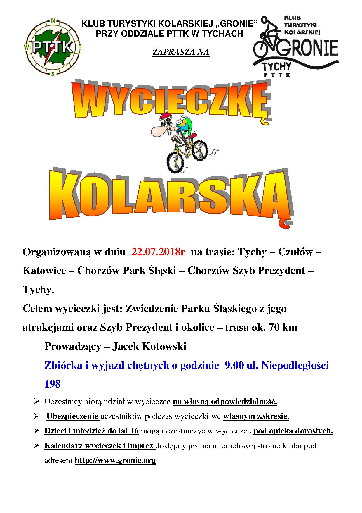 W niedzielę dnia 22.07.2018r. Klub Turystyki Kolarskiej Gronie zaprosił na wycieczkę do Chorzowa gdzie głównym punktem zwiedzania było Planetarium jak i Szyb Prezydent. Trasa wycieczki biegła przez Podlesie, Piotrowice docierając do Parku Śląskiego w Chorzowie. Nie ograniczyliśmy się tylko do zwiedzenia Planetarium ale też zobaczyliśmy jak wygląda obecnie Wesołe Miasteczko, Ogród Zoologiczny, Rosarium, Stadion Śląski. Co da samego Planetarium to obecnie jest zamknięte z racji remontu co nie umniejsza że jego ładna bryła architektoniczna wygląda imponująco. Co do Szybu Prezydent – też warto było tam zajechać i zobaczyć choćby zegar słoneczny gdzie sam szyb byłej kopalni służy za gnomom. Kompleks „Sztygarka” też prężnie żyje swoim życiem. Oczywiście też pokręciliśmy na rowerze by jeszcze obejrzeć parę innych ciekawych rzeczy jak np. pomnik Powstańca Śląskiego. Powrót był przez Chorzów Batory, pogoda była udana a nasza ósemka zadowolona z wycieczki.