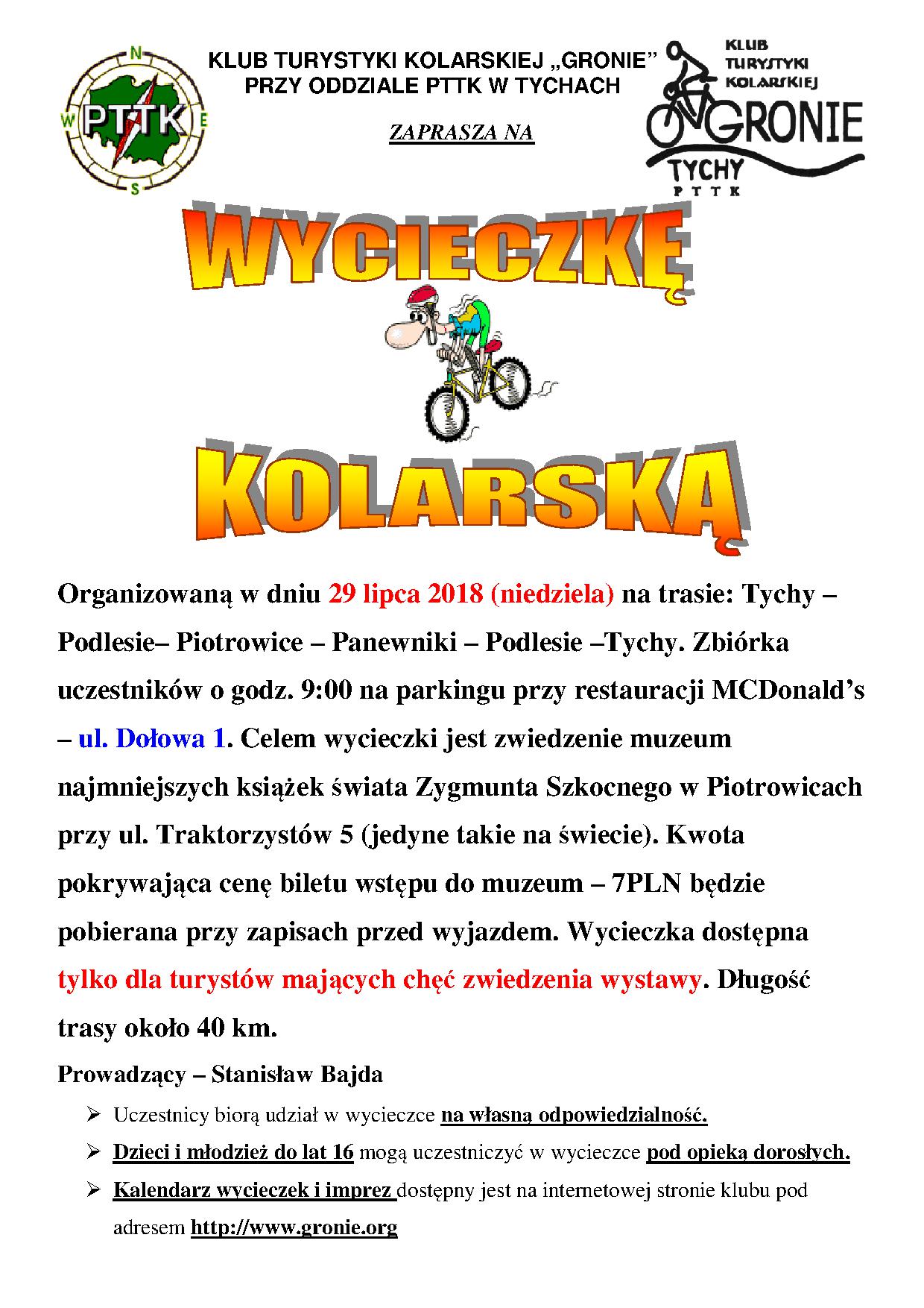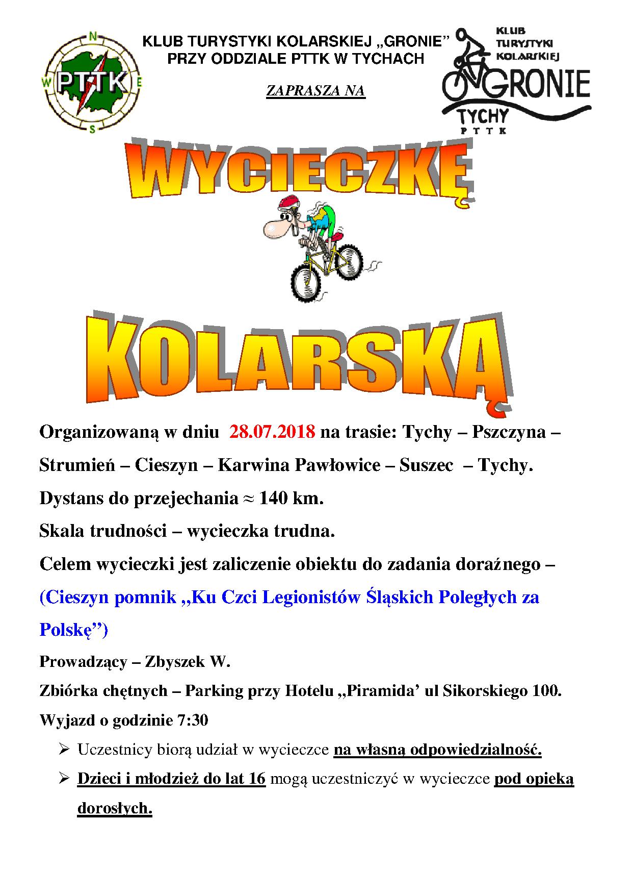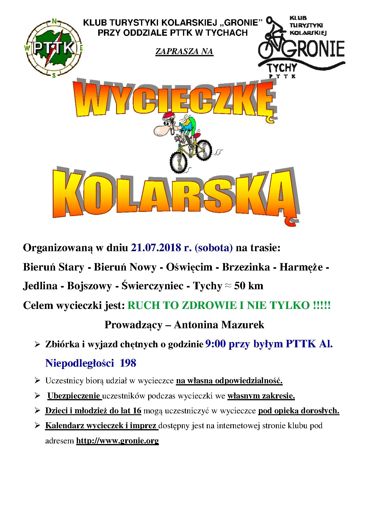 W sobotę 21.07.2018r. Klub Turystyki Kolarskiej GRONIE zaprosił chętnych na wycieczkę rekreacyjną pod hasłem RUCH TO ZDROWIE I NIE TYLKO!! do Oświęcimia. Z Tychów udaliśmy się przez Tereny Przemysłowe ścieżką rowerową do Bierunia Starego odwiedzając Rynek gdyż zawsze jest osoba, która nie miała przyjemności zobaczenia tego miejsca. Z Bierunia Starego dalej ścieżką rowerową dojechaliśmy do mostu nad Wisłą czyli na granicę województw śląskiego i małopolskiego. Do Oświęcimia dojechaliśmy wałem i przez Babice. Pieczątkę potwierdzającą pobyt w tym mieście otrzymaliśmy w nowo otwartym ODDZIALE MUZEUM ZAMEK.