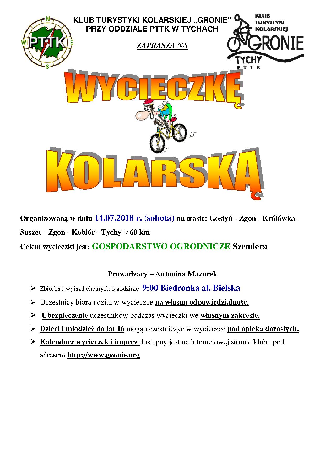 W sobotę dnia 28.07.2018r. Klub Turystyki Kolarskiej Gronie zaprosił na wycieczkę do Goczałkowic, gdzie głównym punktem zwiedzania były Ogrody Kapias. Trasa wycieczki biegła przez Studzienice, Jankowice, Pszczynę docierając Goczałkowic – Ogrodów Kapias. Nie ograniczyliśmy się tylko do zwiedzenia Ogrodów Kapias ale skorzystaliśmy też z lodów i napojów które też można kupić na miejscu. Po doświadczeniach ducha i ciała wracaliśmy do Tychów przez Czarków, Radostowice, Kobiór. Pogoda dopisała, humory również i sądząc po minach turystów rowerowych wycieczka była udana. Trasa wycieczki wyniosła ok. 55 km.