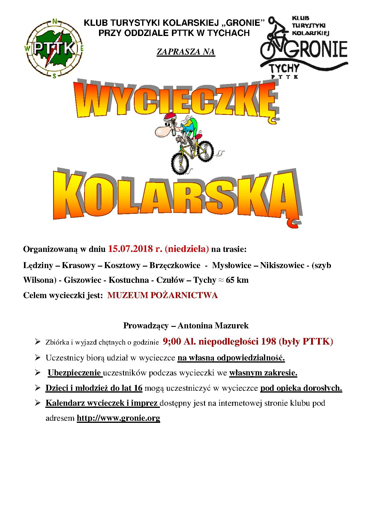 W dniu 15.07.2018r. Klub Turystyki Kolarskiej „GRONIE” zaprosił chętnych na wycieczkę rowerową do MUZEUM POŻARNICTWA w Mysłowicach. Trasa przebiegała drogą asfaltową przez Lędziny – Krasowy – Kosztowy – Brzęczkowice (było trochę górek, które bardzo lubimy???). W niedzielę do MUZEUM wstęp jest bezpłatny z którego nasza10 osobowa grupa skorzystała zwiedzając piękną ekspozycję stałą prezentującą zabytkowy sprzęt gaśniczy. (Foto w galerii) Następnie udaliśmy się do SZYBU WILSON, gdzie trafiliśmy na piękną wystawę artystów z całego świata pt. X Art Naif Festiwal (trochę fotek w galerii). Na PLACU ŚW. ANNY były lody i napoje i pustka. Droga powrotna prowadziła przez Giszowiec ale z Giszowca to już traktem leśnym do Kostuchny, Podlesia i Tychów. Trasa wyniosła 61 km a pogoda ostatnio nam dopisuje więc wszyscy uważają, że RUCH TO ZDROWIE i NIE TYLKO!! GRONIE zaprasza na kolejne wycieczki.