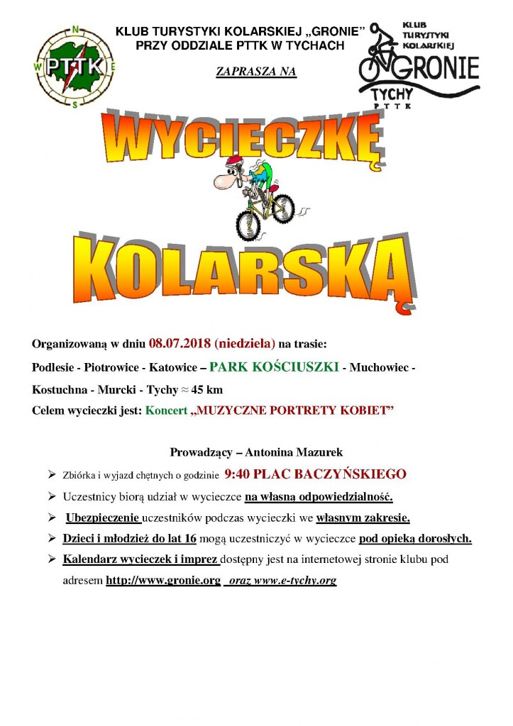 W niedzielę 08.07.2018 r. Klub Turystyki Kolarskiej GRONIE zaprosił chętnych na koncert promenadowy do Parku Kościuszki w Katowicach pt.” Miłość – Portrety Kobiet” grupa była nie liczna bo tylko 7 osób. Trzeba przyznać, że muzyka chociaż barokowa to jednak smutna więc zdecydowaliśmy się wstąpić na NIKISZ /PLAC ANNY/ gdzie odbywał się KIERMASZ SZTUKI NOWOCZESNEJ. Do domów udaliśmy się przez Giszowiec – Murcki – Czułów – Tychy = 50km. Ciepło było więc chłodziliśmy się lodami oraz zimnymi napojami. Zdrowi i szczęśliwi dotarliśmy zadowoleni do domowych pieleszy.