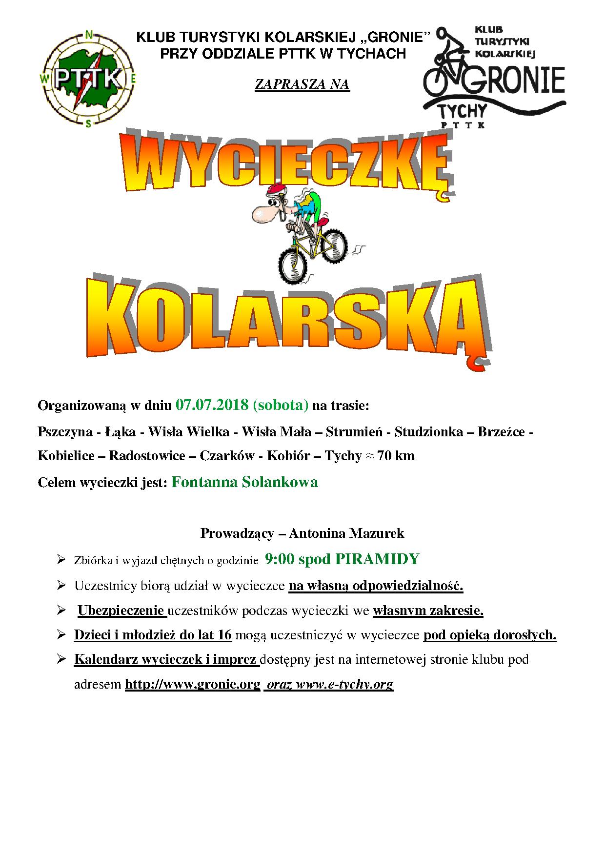 W sobotę 07.07.2018 r. Klub Turystyki Kolarskiej GRONIE w grupie 13 osobowej wyjechał na wycieczkę rowerową do Strumienia. Trasa prowadziła tradycyjnie przez Studzienice – Jankowice – Pszczynę omijając tym razem CENTRUM. Dalej kierowaliśmy się przez Łąkę – Wisłę Wielką – Wisłę Małą i tutaj zwiedzaliśmy drewniany kościółek św. Jakuba, udało nam się również zastać ks. proboszcza, który użyczał nam pieczątki do woli / należy zaznaczyć, że księdza nie często można zastać na farze/. W STRUMIENIU spędzaliśmy czas pod FONTANNĄ wdychając namiastkę jodu z unoszącej się mgiełki. Trasa powrotna prowadziła przez Stódzionkę – Brzeźce – Kobielice – Radostowice – Kobiór – Tychy i wyniosła 77 km. Pogoda nam dopisała i bez awarii z uśmiechem na twarzy przyjechaliśmy do domów na smaczne obiadki.